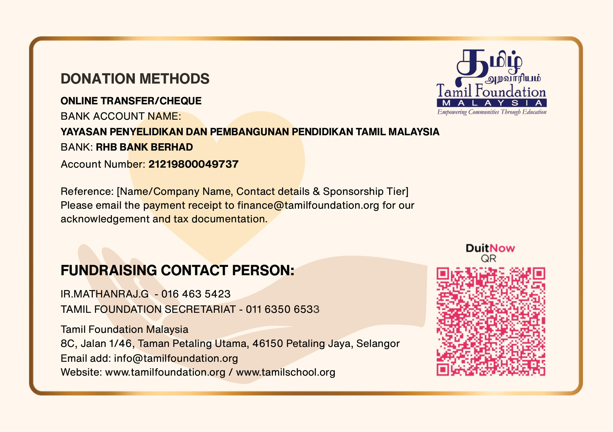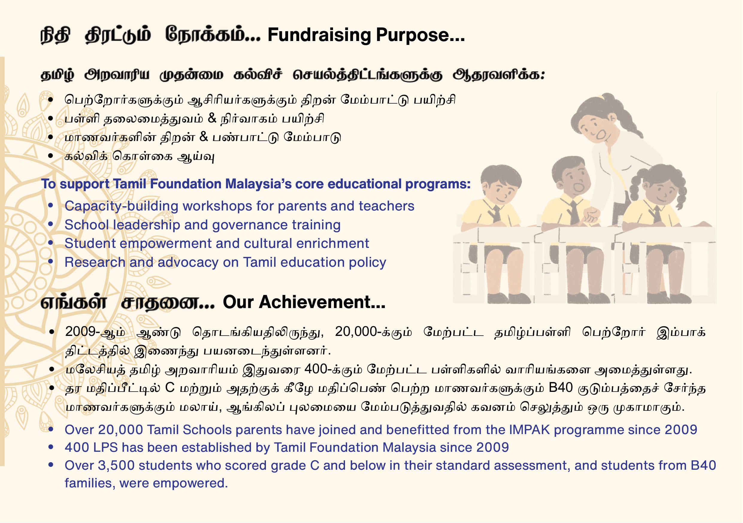To empower the stakeholders of Tamil education so as to promote the cause of Tamil education in Malaysia by uniting the Tamil school committees and promoting and solidifying the relationship among the Tamil schools in Malaysia.